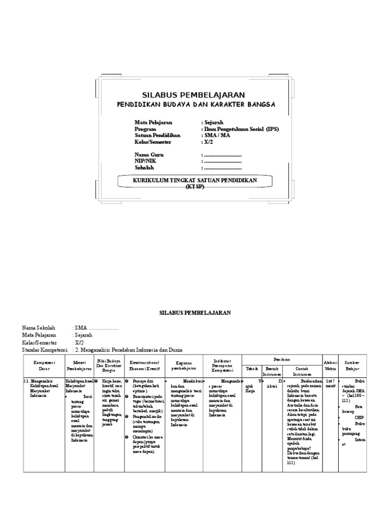 Kelas X Semester Gasal satu Kelas X Semester Genap dua Kelas XI Semester Gasal tiga Kelas XI Semester Genap empat Kelas XII Semester Gasal lima Kelas XII Semester Genap. Silabus Sejarah Indonesia Kelas 10 SMA Kurikulum 2013 Revisi 2017 ini disusun dengan format dan penyajianpenulisan yang sederhana sehingga mudah dipahami dan dilaksanakan oleh guru. XGenap Jenis Konten.